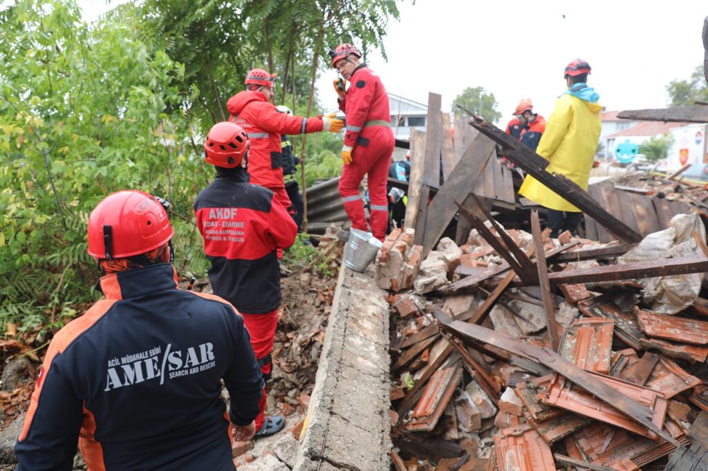 Edirne’de 6,2 büyüklüğünde deprem senaryosuyla enkaz altında kalan düzensiz göçmenleri kurtarma tatbikatı gerçekleştirildi.