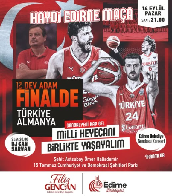 Başkan Gencan paylaşımında, “Haydi Edirne Maça! 🏀🇹🇷 12 Dev Adam, Avrupa Şampiyonası finalinde Almanya karşısına çıkıyor! Bu büyük heyecanı hep birlikte yaşamak için sizleri parka davet ediyorum. Milli heyecanı beraber yaşayalım.” ifadelerine yer verdi.