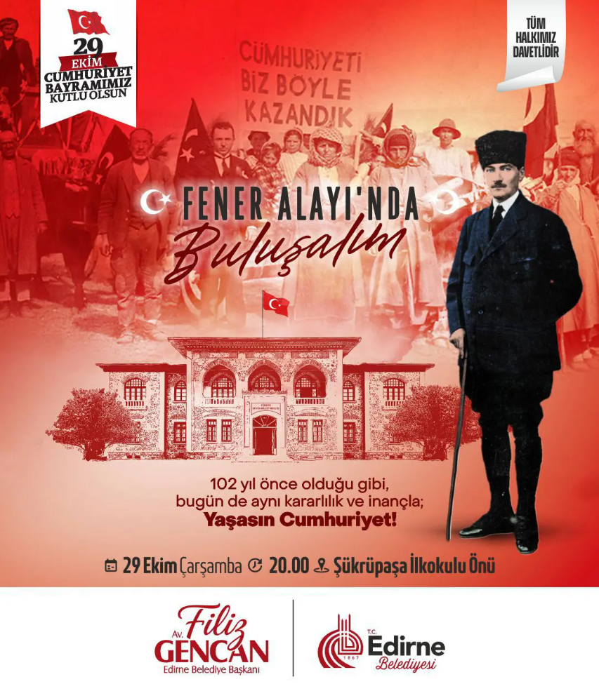 Fener Alayı etkinliğinin 29 Ekim Çarşamba günü saat 20.00’de Şükrüpaşa İlkokulu önünden başlayacağını belirten Gencan, “Cumhuriyetimizin ışığında, Edirne’nin gururla parlayan yüzünü birlikte gösterelim. Cumhuriyet biziz, biz Edirne’yiz!” dedi.