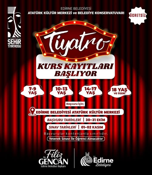 Edirne Belediyesi Atatürk Kültür Merkezi ve Belediye Konservatuvarı tarafından düzenlenen Şehir Tiyatrosu Kurs Kayıtlarımız Başlıyor!