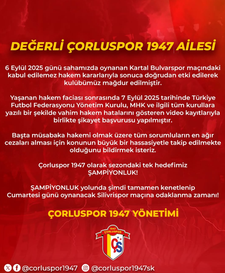 6 Eylül 2025 günü sahasında oynanan Kartal Bulvarspor maçında hakem kararlarının kabul edilemez olduğunu belirten Çorluspor 1947, bu kararlarla sonuca doğrudan etki edilerek kulübün mağdur edildiğini açıkladı.