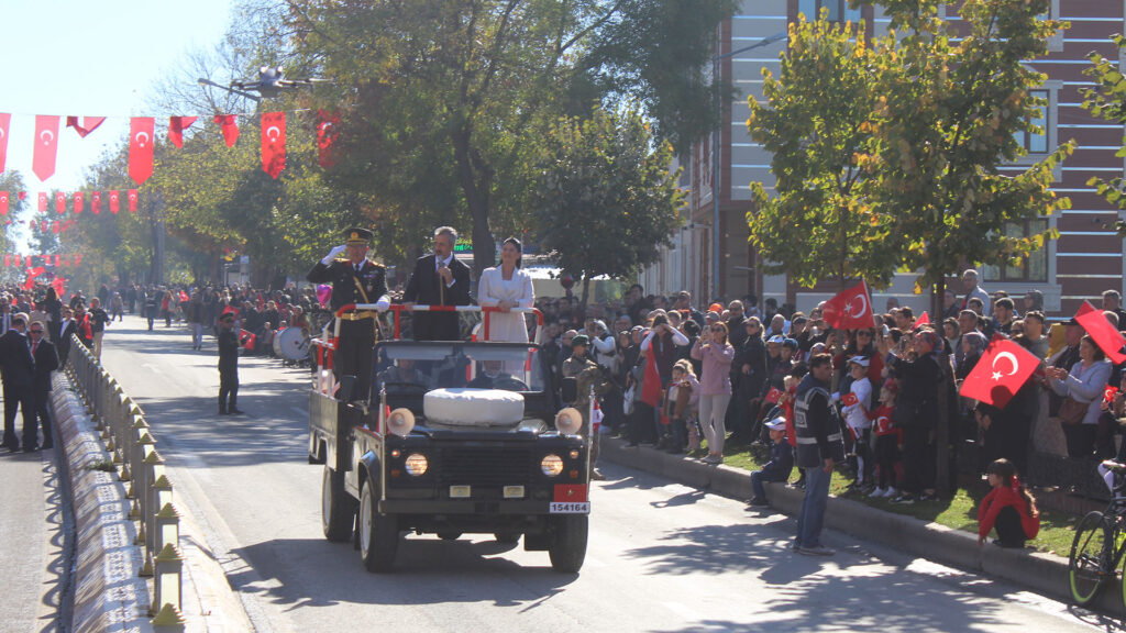 Vali Sezer, Edirne Belediye Başkanı Filiz Gencan ve Garnizon Komutanı Tuğgeneral Yüksel Kolcu ile birlikte tören alanında araç üzerinden vatandaşların Cumhuriyet Bayramı’nı kutladı.