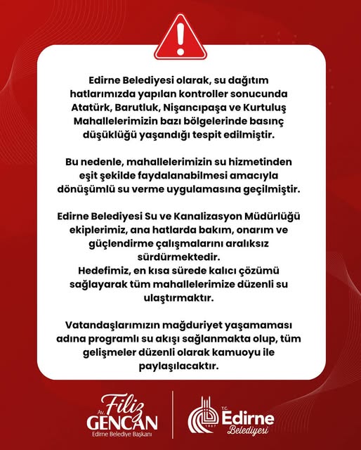 Edirne’de son günlerde yaşanan su kesintileri ve basınç düşüklüğüyle ilgili olarak Edirne Belediyesi bir açıklama yaptı. Belediyeden yapılan açıklamada, Atatürk, Barutluk, Nişancıpaşa ve Kurtuluş Mahallelerinin bazı bölgelerinde su dağıtım hatlarında yapılan kontroller sonucu basınç düşüklüğü tespit edildiği belirtildi. Bu nedenle mahallelerin su hizmetinden eşit şekilde faydalanabilmesi amacıyla dönüşümlü su verme uygulamasına geçildiği ifade edildi.