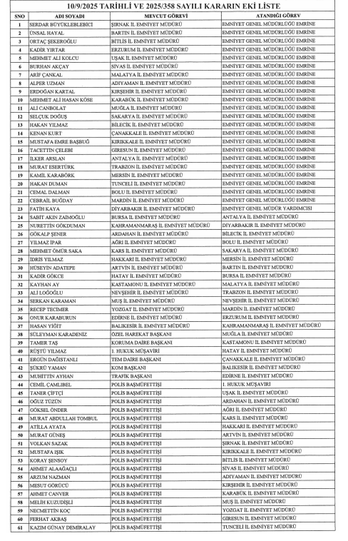 Cumhurbaşkanı Recep Tayyip Erdoğan’ın imzasıyla yayımlanan Resmî Gazete kararına göre 37 ilin emniyet müdürü değişti, 22 ilin emniyet müdürü ise merkeze alındı.