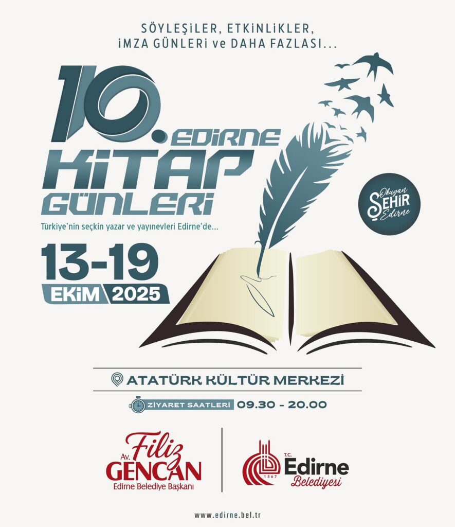 Edirne Belediyesi tarafından düzenlenen Edirne Kitap Günleri, 13–19 Ekim 2025 tarihleri arasında Atatürk Kültür Merkezi ve Belediye Konservatuvarı’nda gerçekleştirilecek.