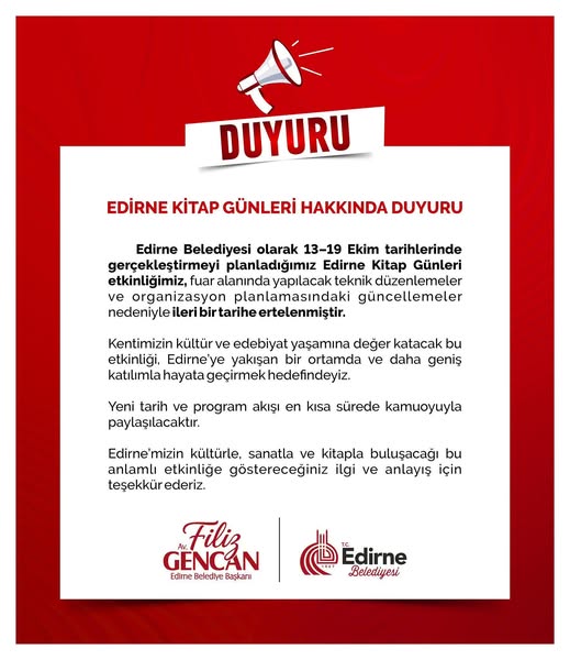 Belediyeden yapılan açıklamada, etkinliğin yeni tarih ve program akışının kısa süre içinde kamuoyuyla paylaşılacağı belirtildi. Açıklamada, “Edirne’yi kitapla, sanatla ve kültürle buluşturacağımız bu özel etkinlikte yeniden bir araya geleceğiz.” ifadelerine yer verildi.