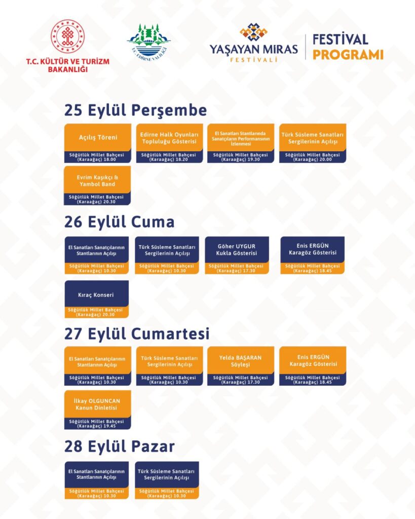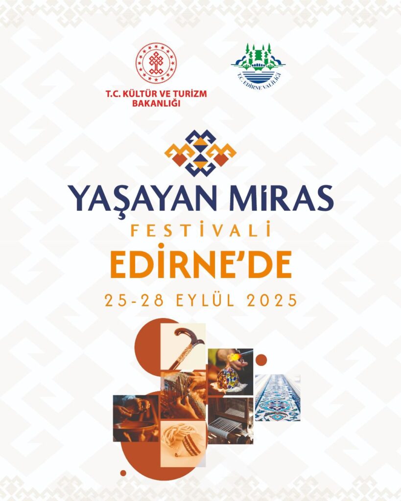 Kültür ve Turizm Bakanlığının maddi katkıları ile Edirne Valiliği ve Mustafa Baştan Kültür ve Sanat Derneği iş birliğinde düzenlenen Edirne Yaşayan Miras Festivali 25-28 Eylül 2025 tarihleri arasında farklı şehirlerden gelen Somut Olmayan Kültürel Miras Taşıyıcılarına ve sanatseverlere ev sahipliği yapacak.