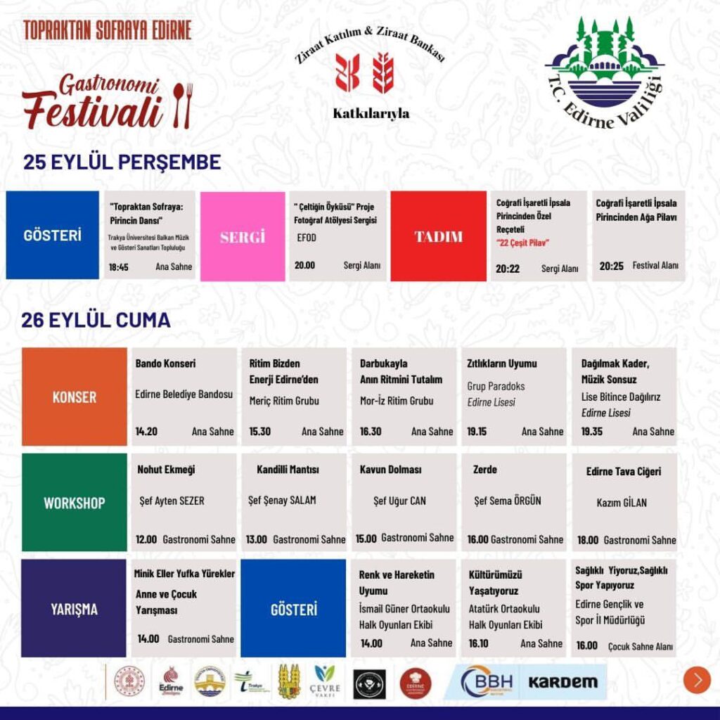 26 Eylül’de festivalin ritmi yükseliyor. Bandolar, halk oyunları, yarışmalar ve usta şeflerin mutfak gösterileriyle etkinlik devam edecek. Edirne tava ciğeri, bademli tatlılar ve geleneksel tarifler katılımcıları bekliyor.