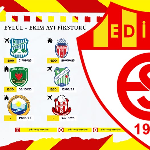Edirnespor, Eylül ve Ekim ayları için maç takvimini paylaştı. Kulüp tarafından yapılan açıklamada, sıradaki rakiplerinin Bursa ekibi Bursa Yıldırımspor olduğu belirtildi.