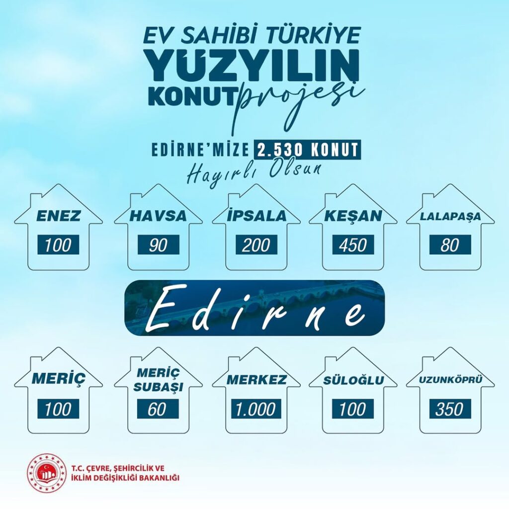 Ev Sahibi Türkiye, Ev Sahibi Edirne” ifadeleriyle paylaşımına başlayan İba, proje kapsamında kentin 9 ilçesinde yeni konutların inşa edileceğini belirtti.
