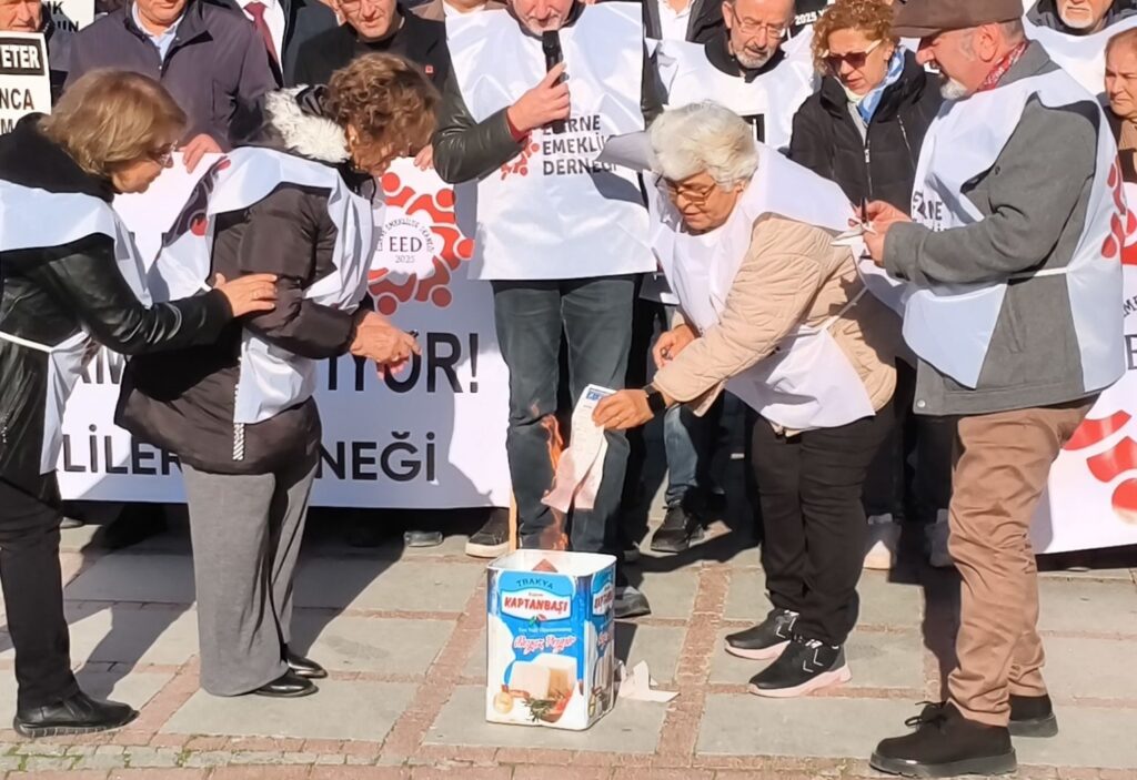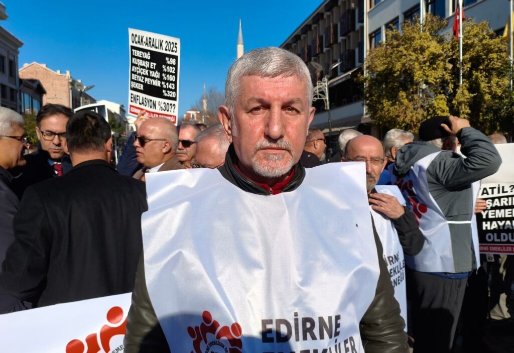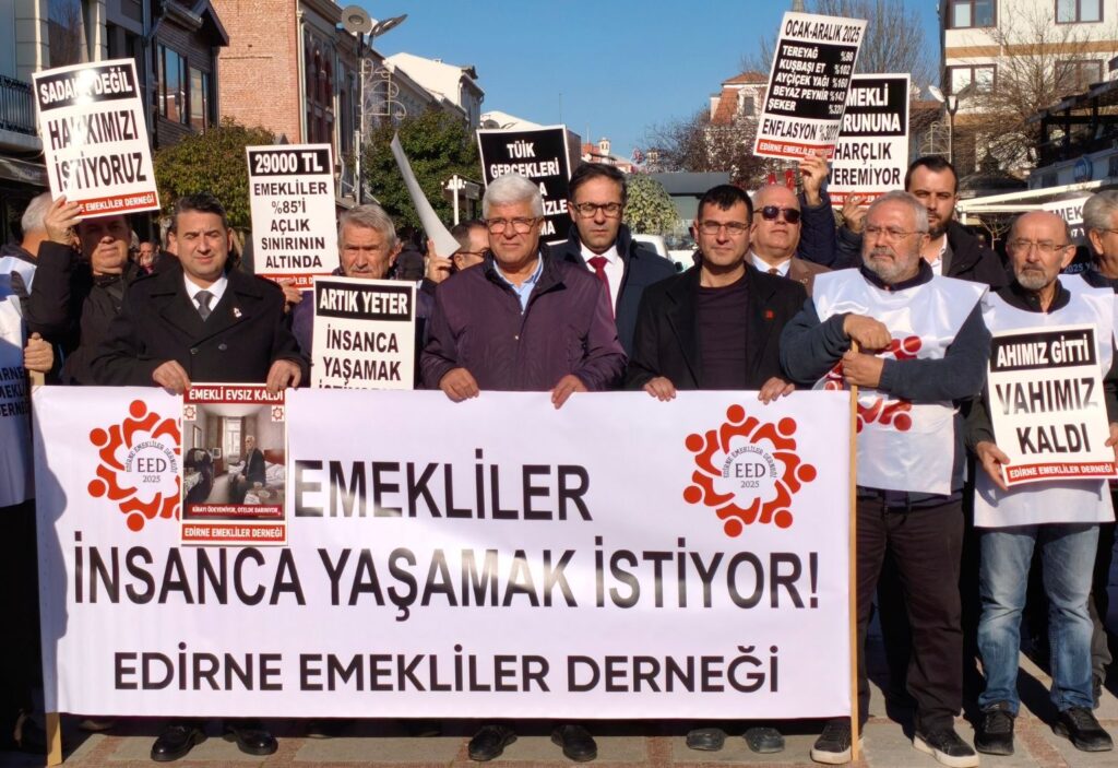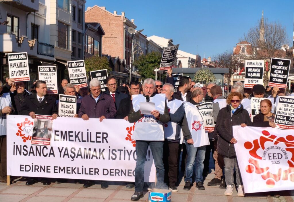 Edirne Emekliler Derneği, Saraçlar Caddesi’nde yaptığı basın açıklamasında emekli maaşlarının açlık sınırının altında kaldığını belirterek, en düşük emekli aylığının asgari ücrete eşitlenmesini ve sosyal hakların genişletilmesini talep etti.