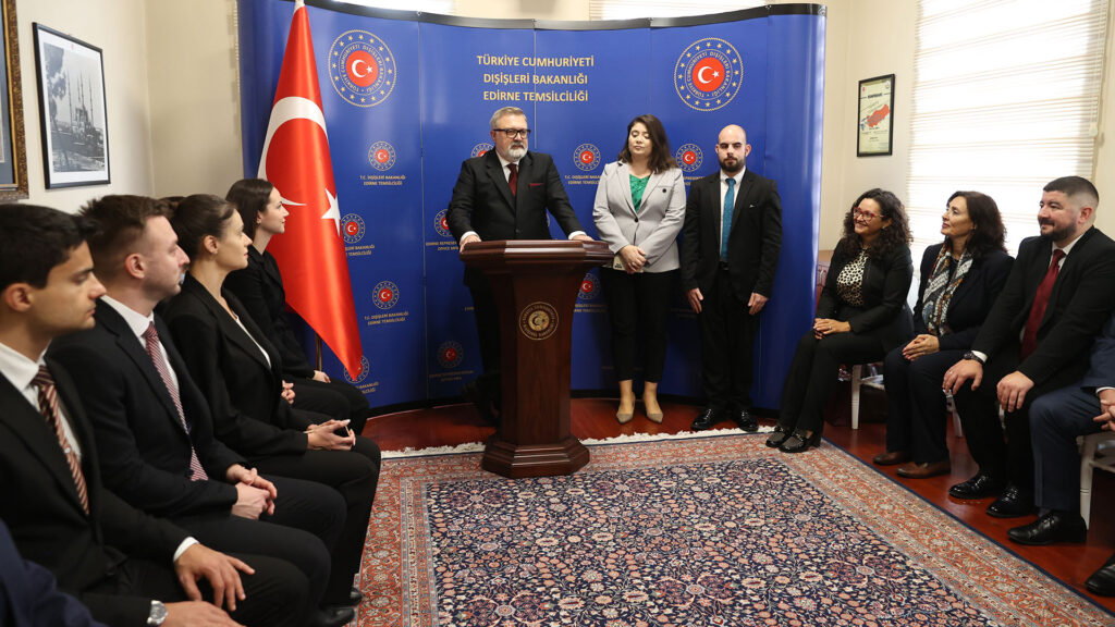 Heyet, daha sonra Dışişleri Bakanlığı Edirne Temsilciliğini ziyaret etti. Temsilci Büyükelçi Murat Ahmet Yörük, genç diplomatlara hitaben yaptığı konuşmada, dünyanın belirsizliklerle dolu bir dönemden geçtiğini belirterek, “Uluslararası hukuk ve kurallara dayalı sistemin giderek aşındığını ve etkisiz hale geldiğini gözlemliyoruz.” dedi. Yörük, Türkiye’nin çok kutuplu sisteme evrilen dünyayı 360 derecelik bir bakış açısıyla yakından takip ettiğini vurguladı.
