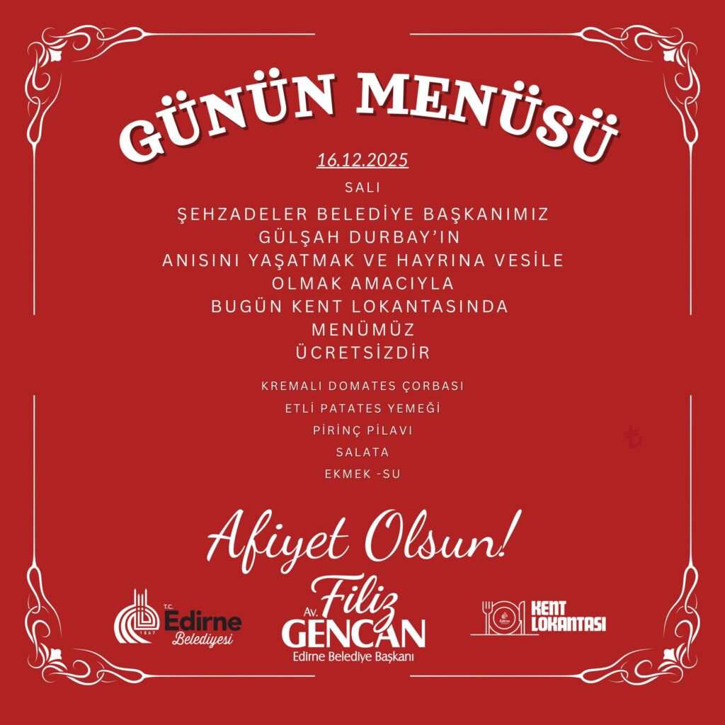 Menüde kremalı domates çorbası, etli patates yemeği, pirinç pilavı, salata, ekmek ve su yer aldı. Yoğun ilgi gören Kent Lokantası etkinliğiyle Gülşah Durbay’ın anısı yaşatılmış oldu.