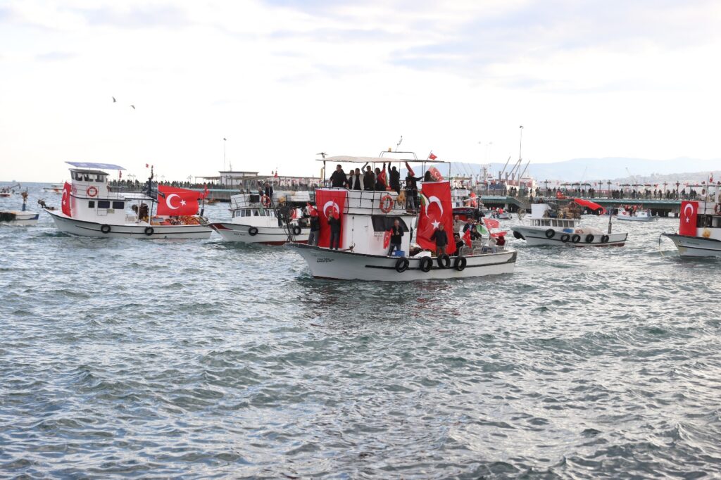 Tekirdağ’da, İsrail ablukasını kırmak, Gazze’ye insani yardım ulaştırmak amacıyla yola çıkan ve İsrail’in saldırısına uğrayan Küresel Sumud Filosu için “selamlama” etkinliği gerçekleştirildi. Tekirdağ Süleymanpaşa Su Ürünleri Kooperatifince, Süleymanpaşa Balıkçı Barınağı’nda düzenlenen etkinlik kapsamında limandaki tekneler Türk ve Filistin bayraklarıyla donatıldı.