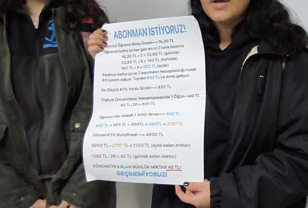 Edirne’de Trakya Üniversitesi öğrencileri, kent içi toplu ulaşımda abonman sisteminin uygulanması talebiyle başlattıkları imza kampanyası kapsamında topladıkları 200 imzalı dilekçeyi, Edirne Belediye Meclisi Ocak ayı olağan toplantısının ardından Belediye Başkanı Filiz Gencan’a teslim etti.