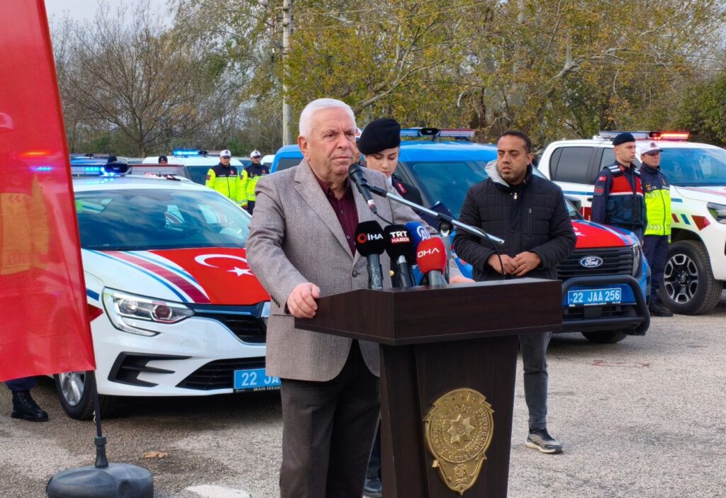 Edirne Valisi Yunus Sezer, güvenlik birimlerinde 10 yılı aşan araçların yenilenmesi için yürütülen projeye değinerek, devletin güvenlikten hiçbir zaman tasarruf etmediğini söyledi. Hayırsever iş insanlarının katkılarıyla araç filolarının güçlendiğini belirten Sezer, devlet ve millet iş birliğinin önemine dikkat çekti.