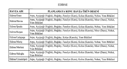 | Edirne/İpsala | Arpa, Ayçiçeği (Yağlık), Buğday, Fasulye (Kuru), Kolza (Kanola), Mısır (Dane), Nohut, Yem Bitkileri |