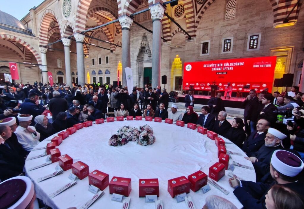 Edirne Valiliği tarafından Selimiye Camii’nde düzenlenen Büyük Selimiye İftarı, yaklaşık 6 bin 500 kişinin katılımıyla gerçekleşti. Programa Edirne Valisi Yunus Sezer, Edirne Belediye Başkanı Filiz Gencan, Edirne milletvekilleri, Diyanet İşleri Başkanı Prof. Dr. Safi Arpaguş ve 8 Balkan ülkesinden çok sayıda konuk katıldı. Etkinlik, Kur’an-ı Kerim tilaveti ile başladı.