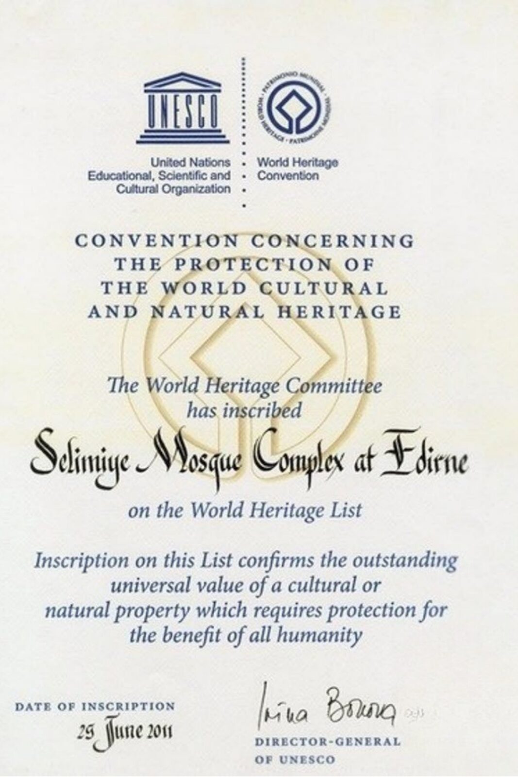 Anlaşıldığı kadar bitirilmiş bulunan kubbe bezemelerinin değiştirilmesini talep eden hat sanatçıları Selimiye Camii’nin UNESCO Dünya Mirası olduğunu dikkate almaksızın bir öneri geliştirmişler ve ısrarla karar haline getirilmesini sağlamışlardır. UNESCO Dünya Mirası Beratı Üzerinde : “tüm insanlığın yararına korunması gereken varlıktır” yazıyor.