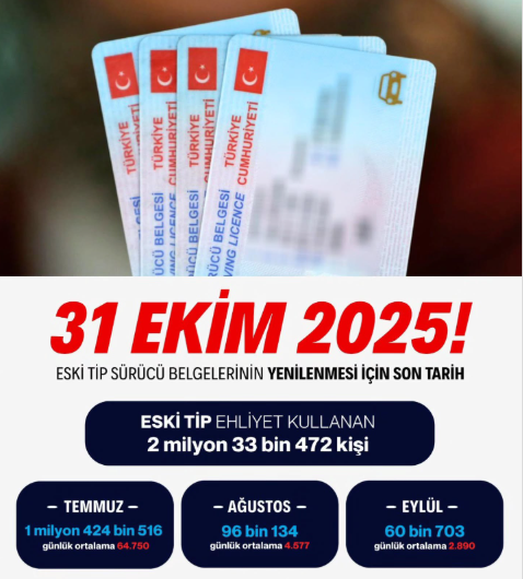 Eski tip SÜRÜCÜ BELGELERİNİN yenilenmesi için SON TARİH: 31 Ekim 2025.