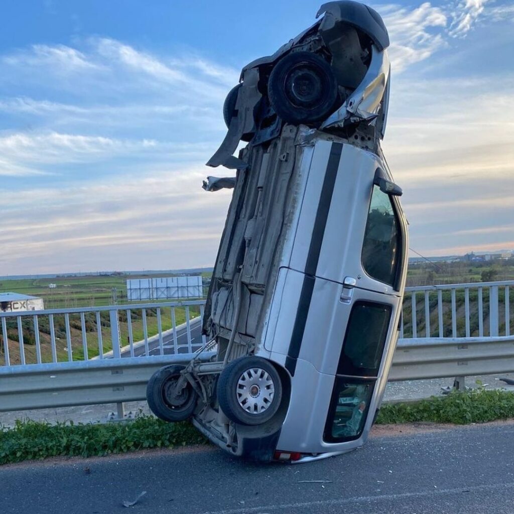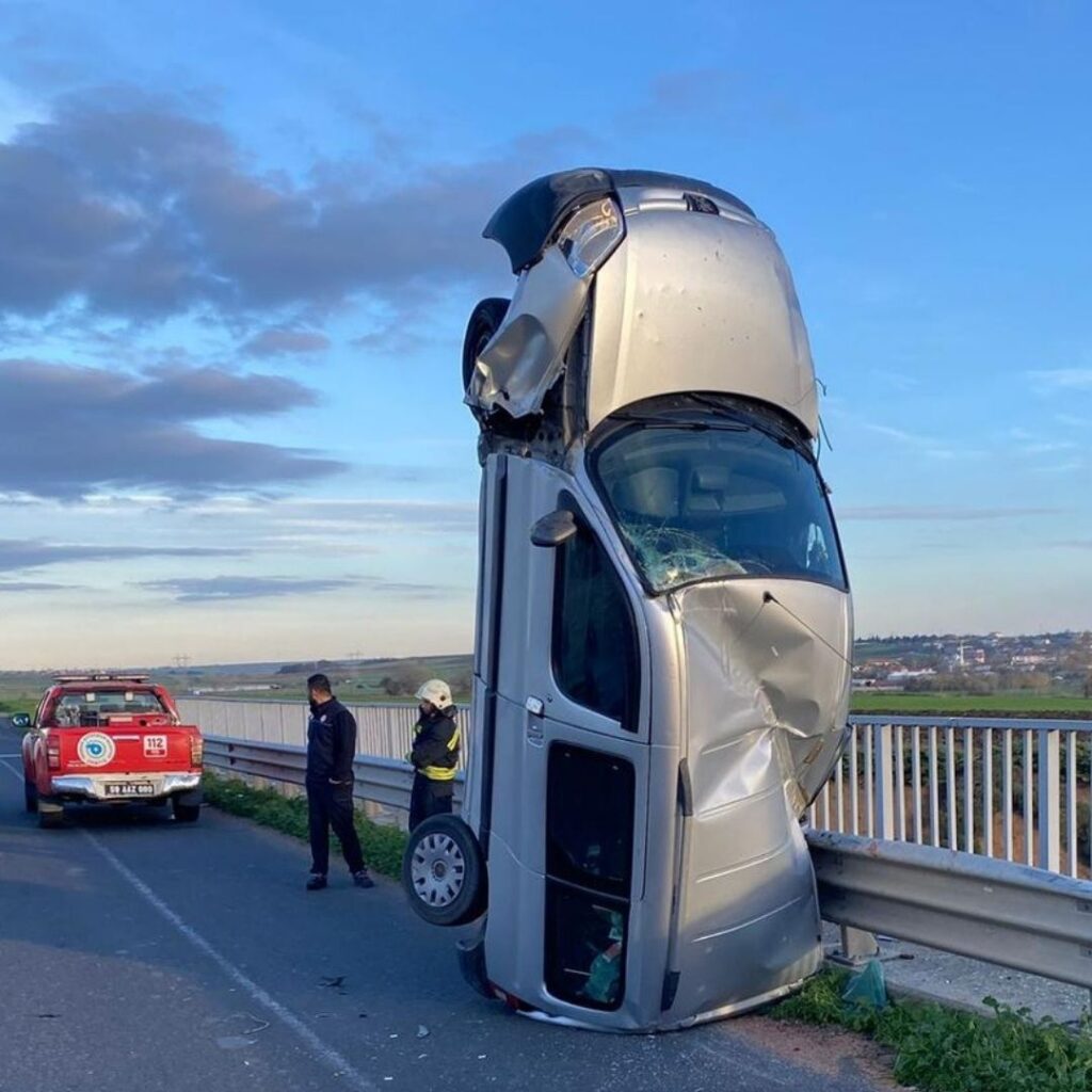 Araç bariyere çarpıp bagajı üzerinde dik kaldı, kazada 2 kişi yaralandı.