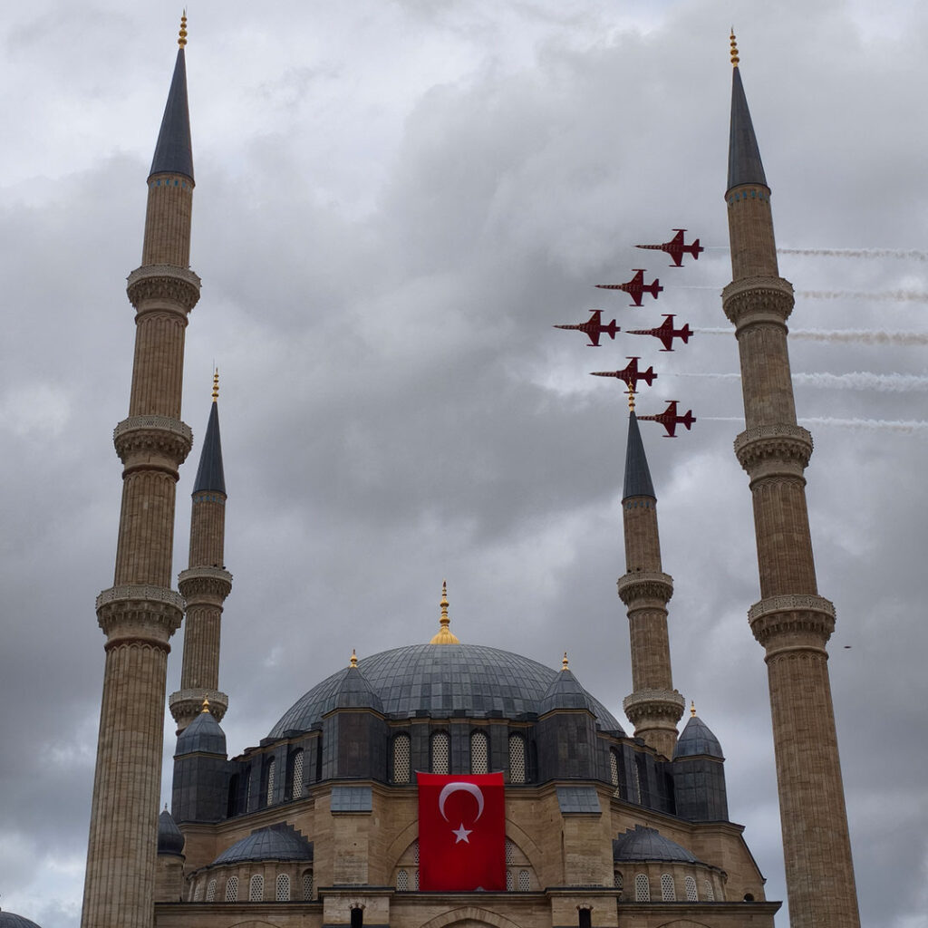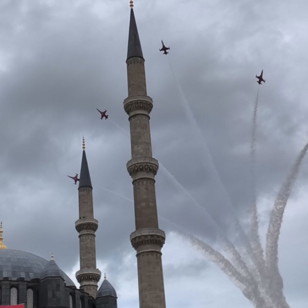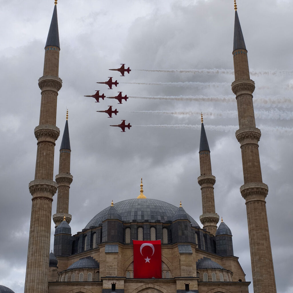 Edirne’de 29 Ekim Cumhuriyet Bayramı kutlamaları kapsamında Türk Hava Kuvvetleri’nin dünyaca ünlü akrobasi timi Türk Yıldızları, Selimiye Meydanı semalarında unutulmaz bir gösteriye imza attı. Gösteriyi izlemek isteyen binlerce vatandaş, saatler öncesinden meydanı doldurdu. Saat 16.30’da başlayan uçuşta, Türk Yıldızları Selimiye Camii’nin minareleri üzerinden geçerek Edirnelileri selamladı.