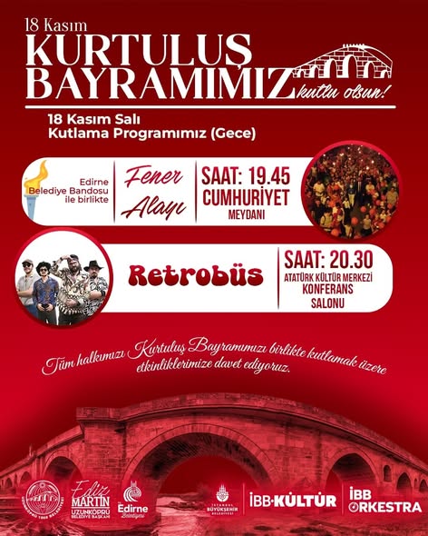Aynı gün saat 15.00’te Kurtuluş Sergisi açılışı Kültür ve Sanat Evi (Aziz Ioannis Kilisesi)’nde yapılacak. Akşam ise saat 19.45’te Cumhuriyet Meydanı’nda Fener Alayı düzenlenecek; etkinlikte Edirne Belediye Bandosu yer alacak.