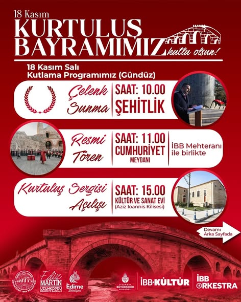 Uzunköprü Belediyesi, ilçenin düşman işgalinden kurtuluşunun 103. yıl dönümünü büyük bir gurur ve coşkuyla kutlayacak. Belediye tarafından yapılan açıklamaya göre, 18 Kasım Salı günü düzenlenecek kutlama programı kapsamında bir dizi etkinlik gerçekleştirilecek. Günün ilk etkinliği Çelenk Sunma Töreni olacak ve saat 10.00’da Şehitlik’te başlayacak. Ardından saat 11.00’de Cumhuriyet Meydanı’nda resmi tören düzenlenecek. Tören, İstanbul Büyükşehir Belediyesi Mehteran Takımı eşliğinde gerçekleştirilecek.