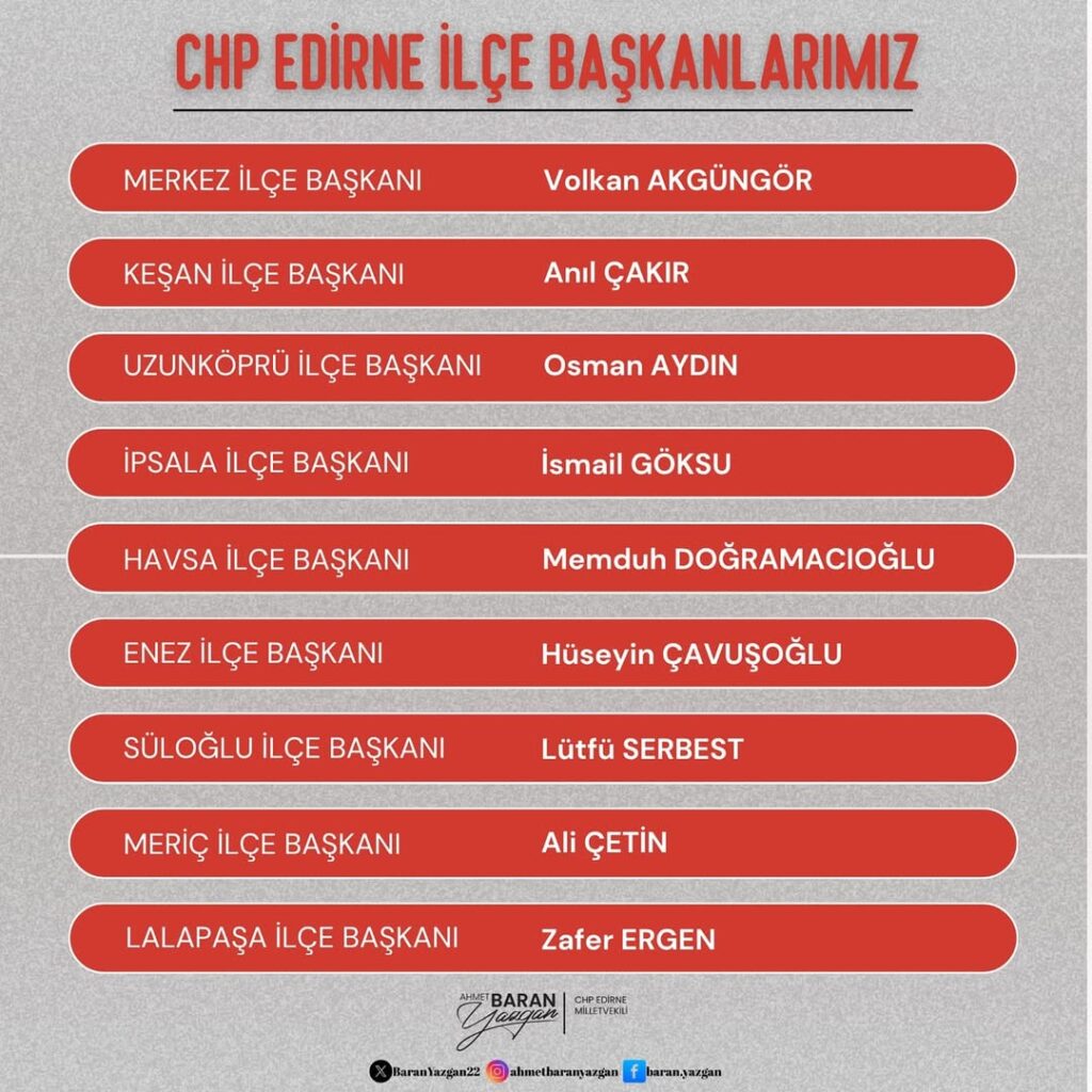 Cumhuriyet Halk Partisi Edirne Milletvekili Ahmet Baran Yazgan, Edirne’de gerçekleştirilen ilçe kongrelerinin tamamlandığını duyurdu.
