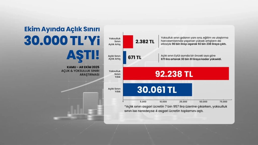 Ekim ayında açlık sınırı, bir önceki aya göre 671 lira artarak 30 bin 61 liraya çıktı. Gıda dışındaki ihtiyaçlar için yapılması gereken harcama ise 1.711 lira artışla 62 bin 177 liraya yükseldi.